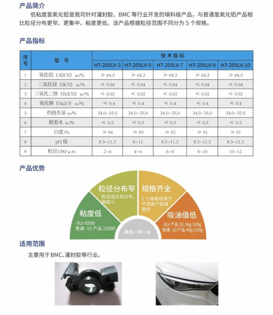 低粘度氫氧化鋁是我司針對灌封膠、BMC等行業(yè)開發(fā)的調(diào)料級產(chǎn)品,與普通氫氧化鋁產(chǎn)品相比粒徑分布更窄、更基重,年度更低,該產(chǎn)品根據(jù)粒徑范圍不同分為5個(gè)規(guī)格。